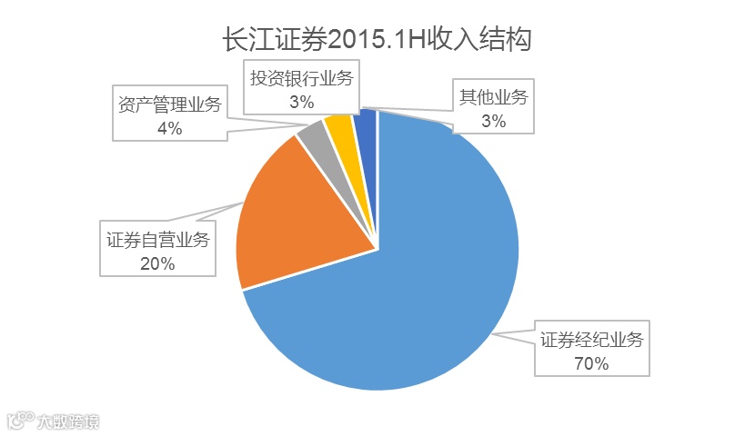 根据证券业协会公布的证券公司经营业绩排名,2014年长江证券总资产排名17位、净资产排名18位、营业收入排名17位、净利润排名15位。可见总体而言,长江证券在100多家券商中约处于10-20名之间,属于典型的大中型地方券商。而公司业务结构则比较偏向传统的经纪业务。根据wind数据,2015年前三季度长江证券经纪业务收入38亿元,市场份额为1.8%,行业排名第16位,经纪份额在同类公司中居于前列,其传统经纪业务占营收比例一直在50%以上。