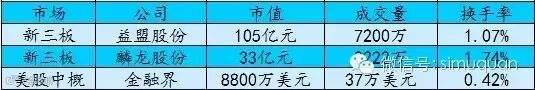 新三板上的益盟股份市值105亿元,上周成交7200万,换手率1.07%;麟龙股份市值33亿元,上周成交2222万,换手率1.74%。美股中概的金融界,市值8800万美元,上周成交37万美元,换手率0.42%。