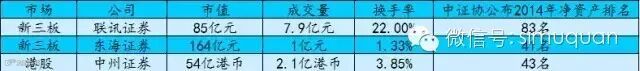 新三板上的联讯证券,83亿市值,上周成交7.9亿元,换手率22%;东海证券164亿元市值,上周交易额1亿元,换手率1.31%。