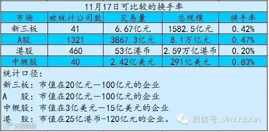 为此,笔者将新三板市场中市值在20亿元-100亿元之间的企业、A股中市值在20亿元-100亿元之间的企业、中概股中3亿美元-15亿美元、港股中25-120亿元的企业进行比较,试图一窥几个市场的流动性现状。