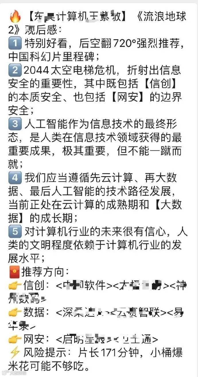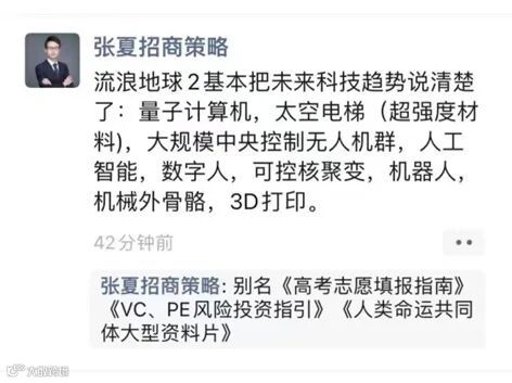 1月27日,招商证券策略首席分析师张夏在朋友圈发表了一则《流浪地球2》观后感,从卖方研究视角剖析这部科幻片中潜在的投资机会。
