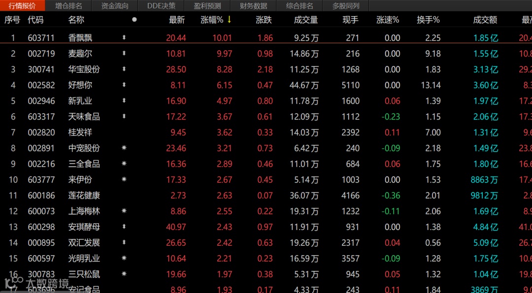 4月17日消息,预制菜板块盘中异动拉升,得利斯涨停,报价6.68元,封单超19万,中水渔业、天马科技、全聚德涨超4%,五芳斋、千味央厨、惠发食品、龙大美食等快速跟涨。