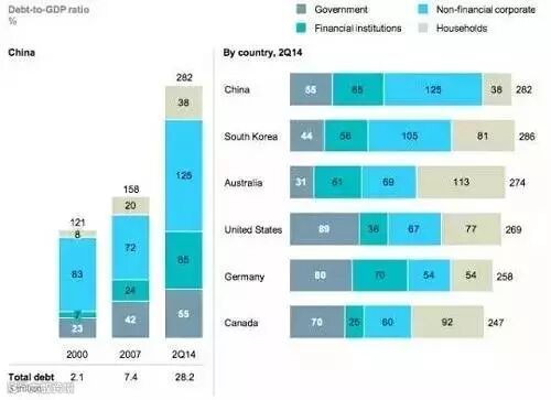 中国金融最大的问题,也可以说最大的风险,是高杠杆。和其他国家都不一样的是,中国的债务主要集中在企业部门,2014年中国企业债务余额是14.2万亿美元,占到我们GDP的135%,企业部门的负债在全世界是最高的。中国经济如果要出问题,就是出在这个地方。而且到目前为止,这个现象还没有得到改善。