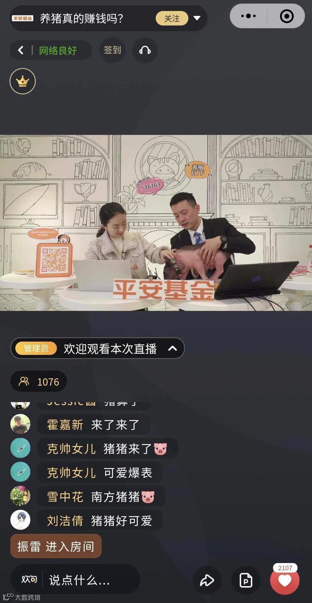 当时他已经不止在一次饭局上听朋友晒过基金收益,在上班路上的地铁通道里,在小区电梯的电视屏幕上,他已经看到过不少基金广告,甚至有一次在刷短视频时,他还刷到了基金经理的直播。平安基金为了推广旗下的一支畜牧养殖基金,竟然在直播间带来了一头小猪。