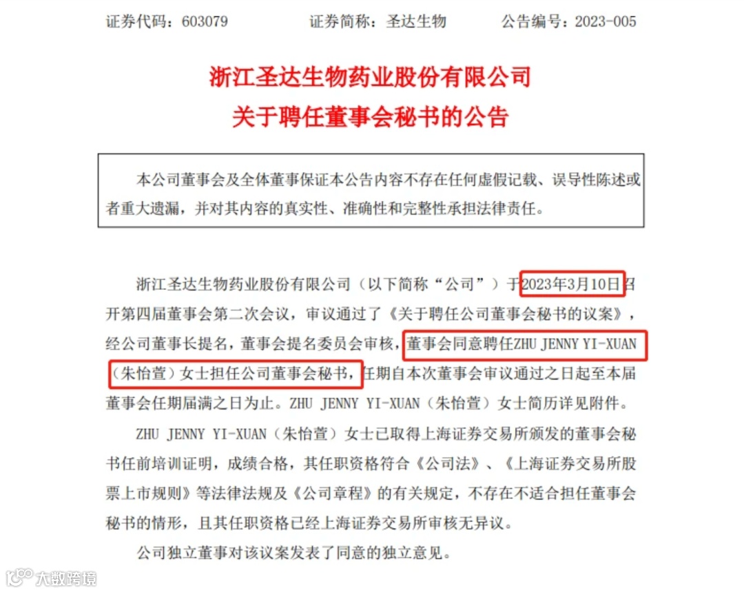 3月10日晚间,圣达生物(603079)公告,董事会同意聘任朱怡萱担任公司董事会秘书。