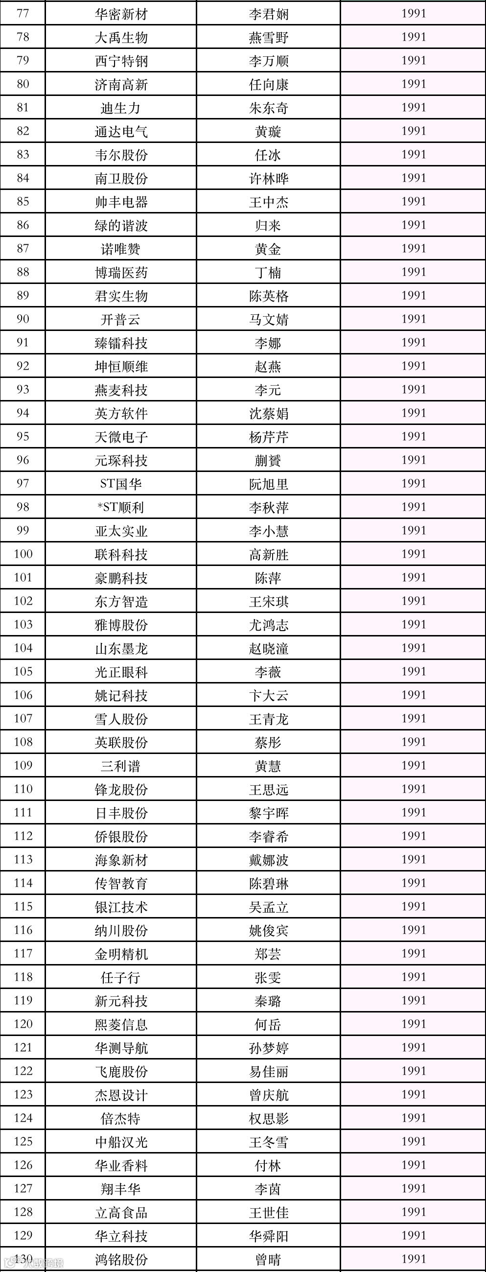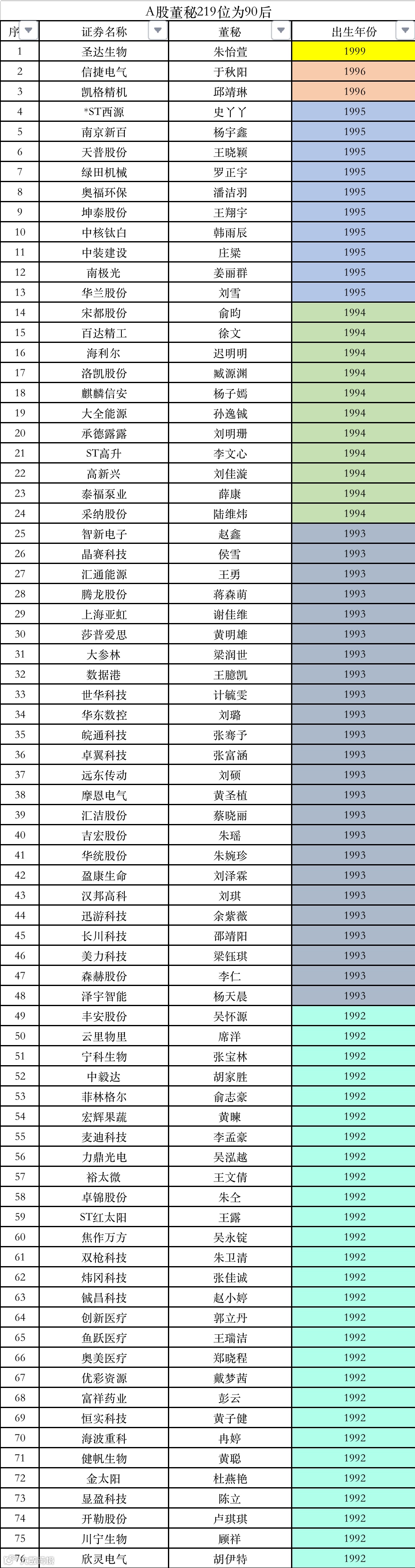 此外,坤泰股份董秘王翔宇、中核钛白董秘韩雨辰、华兰股份董秘刘雪、南京新百董秘杨宇鑫等10人均出生于1995年