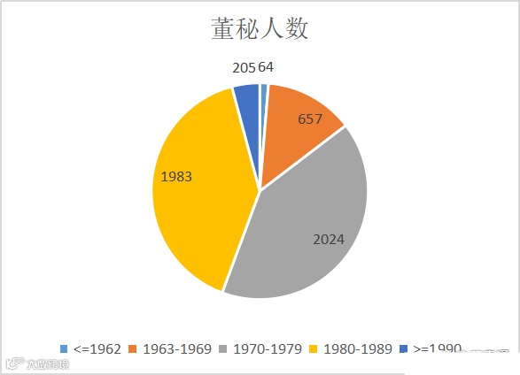 统计数据显示,1962年(含1962年)之前出生的董秘有64位,其基本已到法定退休年龄;1963年-1969年出生的董秘有657位;1970年-1979年出生的董秘有2024位;1980年-1989年出生的董秘有1983位;“90后”董秘有219位。