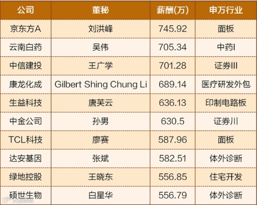 京东方A(000725.SZ)的董秘收入领跑A股,达到745.92万元,中信建投(601066.SH)的董秘次之,年薪701.28万元,是仅有的2位年薪破700万元的“大佬”。