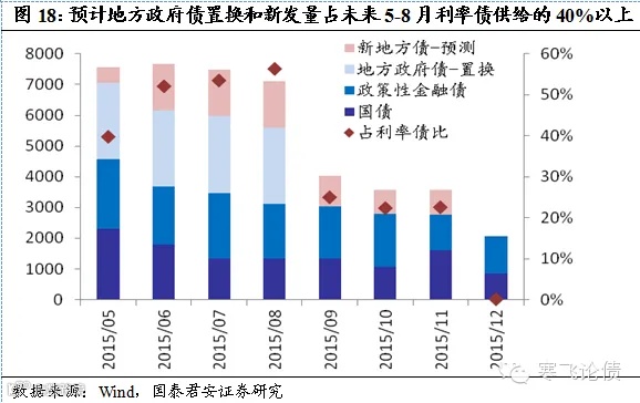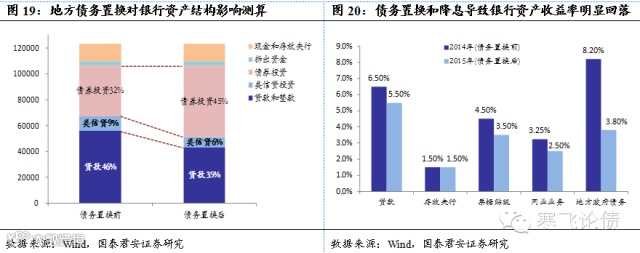 资产需调整和重配置。对于金融机构来说,债务置换相当于锁定一部分到期新增投资的期限(延长)、回报(下降),对其他新增资产而言将产生负面冲击。边际上来看,置换回表的地方政府债相比商业银行持有存量国债/新增债券投资比例巨大(分别为15%和30%),因此对新增其他债券投资冲击也会比较大,主要体现在会降低其他新增债券的久期和提高预期收益率。