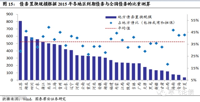 截至2013年6月30日地方负有偿还责任的存量债务中,2015年需到期偿还1.86万亿,1万亿总债务额度占2015年到期政府负有偿还责任债务的53.8%,分地区的债券额度按照各地区2015年到期债务和全国统一比例测算。其中,江苏、湖北、四川、广东和浙江置换规模最大,分别为520-810亿,海南、青海和宁夏置换规模较小,低于100亿,重庆、江苏和湖南置换债务占广义地方债务比最低,为27%、28%和29%。