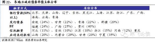 从各省市地方政府债务举债主体分布来看,以银行贷款为主的省份在定向置换中将相对顺利,主要以北京、天津、山西等为主,贷款占比超过60%;而安徽、甘肃、青海和新疆等省市发债规模占比较高,超过20%;而BT、信托和应付未付款占比较大的省市面临的债务置换压力相对更大,如贵州以BT融资占比超过40%,宁夏、内蒙等省应付未付款占比超过30%,浙江等信托融资占比超过15%,与这些非银行主体的债务置换,可能面临更为艰难的重组谈判过程。