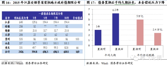 发行久期大幅拉长。从江苏、安徽等省市披露的首批地方政府债发行额度来看,5年、7年和10年发行量占比超过80%,与存量地方债的平均久期 3年相比,这7个省市新发地方债平均久期达到6.5年,比之前大幅拉长。按照地方政府性债务余额15万亿计算,则债务滚动的平均每年偿还本金规模从5万亿下降至2.4万亿,地方政府偿债压力大幅减轻。