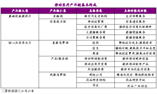 移动医疗横跨医药、TMT、金融等多个行业,产业链环节众多。我们认为,可以分为基础设施提供方和核心业务参与方两大阵营。相关各方通过数据流、资金流、设备及服务流三条链路相互勾连,形成统一的完整闭环。