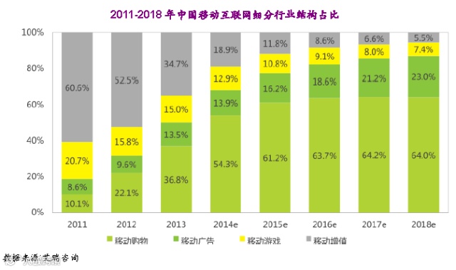 2014年中国移动互联网各细分行业结构分布中,移动购物一枝独秀占到54.3%的份额,较上年提高17.5个百分点,预计到2018年将占到整体份额的64%。移动广告市场从2014年开始逐步向成熟化发展,占据13.9%的市场份额,预计到2018年其占比可达到23%,稳步提升。移动增值作为曾经移动互联网的支柱领域,随着电信运营商管道化趋势发展,依靠其生存的SP/CP模式受到冲击,移动增值份额大幅缩减,预计到2018年其占比会进一步降低到5.5%。近几年移动游戏行业发展硕果累累,依靠人口红利优先获得了大量关注,而随着企业资本化趋于理性,更多具有运营研发优势的端游企业的进入,都会给移动游戏行业的发展提供更良好的驱动力。