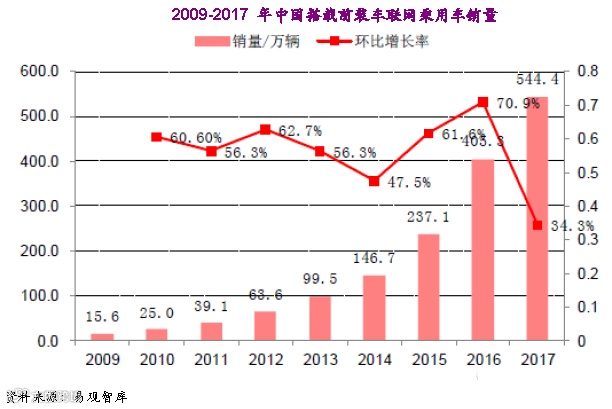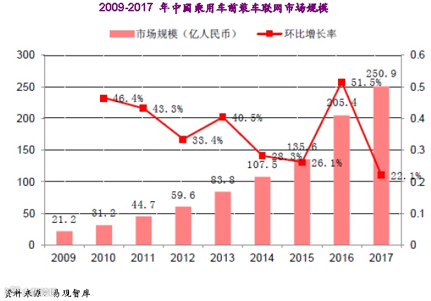 从乘用车角度来看,中国前装车联网销量保持高速增长,2013年已达到146万辆,渗透率为10%,预计2017年将超过540万辆,13-17年复合增速为52.9%,渗透率达到20%以上。2013 年前装车联网市场规模为83.8亿元,同比增长40.5%,未来仍将维持快速增长,预计2017 年将超过250 亿元,13-17年复合增速为31.5%。