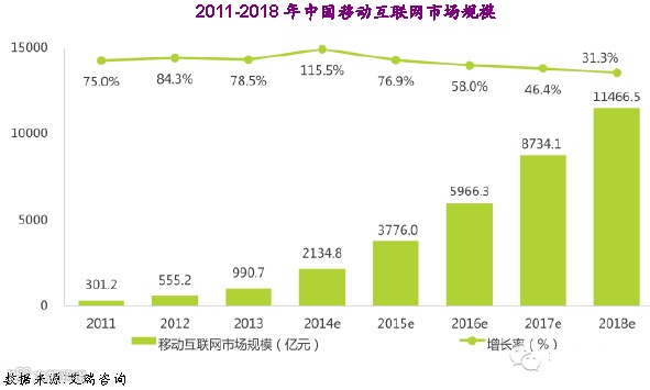 注释:1.中国移动互联网市场规模包括移动增值、移动购物、移动广告、移动游戏等细分领域市场规模总和;2.从2012Q2开始,移动购物统计的市场规模为营收规模;3.从2011Q4开始,移动互联网市场规模包括手机和平板电脑两类移动设备上创造的市场规模总和;4.从2014年Q4数据发布开始,不再统计移动营销的市场规模,移动广告的市场规模包括移动展示广告(含视频贴片广告,移动应用内广告等)、搜索广告、社交信息流广告等移动广告形式,统计终端包括手机和平板电脑。短彩信、手机报等营销形式不包括在移动广告市场规模内。