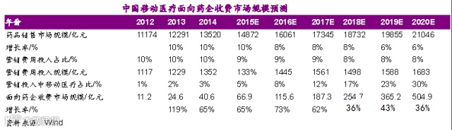 面向药企收费的核心是满足其营销需求,主要可以分为两类:基于流量的广告收费和基于数据的精准化推送收费,例如翼多和丁香园等。广告收费是短期内面向药企的主要盈利模式,而精准化推送服务将是未来的发展方向。面向药企收费是市场受限较小的模式,但是其存在进入壁垒,即建立在较多用户流量和数据基础之上。我们认为,面向药企收费将是间接消费端率先爆发的市场,其具有较大的市场空间和较多的创新点,对于医院、医生、患者等产业链关键环节均能采用不同的盈利模式。预测 2014年面向药企收费模式市场空间为40.6 亿元,同比增长 65% ,2020年将达到 504.9 亿元,2014-2020 年复合增长率为 52%。(药品销售市场规模以2012-2013 年为基准,因为国内医保控费的缘故,市场规模增速会逐年小幅降低)