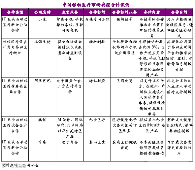 国内移动医疗市场目前仍处于群雄混战的初级阶段,产品线分散,行业集中度低,大规模正面竞争局面尚未出现,因此目前市场上并购案例较少,但合作案例却层出不穷。我们认为,随着市场逐渐进入高速发展期,三大阵营对于技术、资金、用户等资源争夺将日趋激烈,任何一方都无法凭借一己之力迅速占领市场,并购频率将大幅提升,合作与并购将同时成为未来市场两大重要主题。