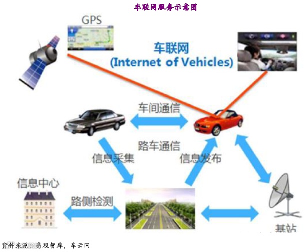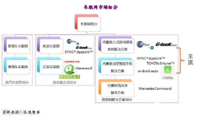 车联网即以车内网、车际网和车载移动互联网为基础,按照约定的通信协议和数据交互标准,在车-X(X:车、路、行人及互联网等)之间,进行无线通讯和信息交换的大系统网络。按照汽车类型可分为:乘用车车联网、商用车车联网;按照安装方式可分为:前装车联网(G-book)、后装车联网(腾讯路宝盒子);按照联网解决方案可分为:内置嵌入式移动通信解决方案(OnStar)、内置集成型智能手机解决方案(Carplay)、内置网络共享解决方案(Mercedes Command)。