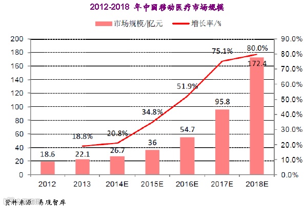 中国移动医疗产业起步较晚,未来发展有望逐渐提速。2011-2013 年,随着移动互联网时代的来临,移动医疗初创项目开始受到资本的热捧,但由于政策、技术等多种壁垒限制,市场规模难以迅速扩大。进入2014 年,随着成熟商业模式开始出现,用户规模逐渐积累,特别是BAT、360、京东等互联网巨头积极布局,移动医疗迎来了新一轮热潮,市场规模扩展有望逐渐提速。据易观智库发布的数据显示,2013 年中国移动医疗市场规模为22.1 亿元,同比增长18.8%,预计2018 年将达到172.4 亿元,复合增长率超过50%。