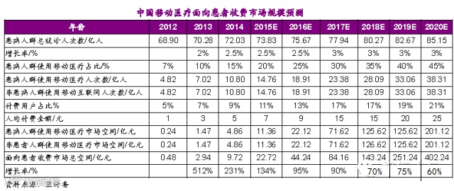 盈利来源分为患病人群(需求为诊断治疗、慢病监测等)和非患病人群(需求为健康管理等) ,由于法精确获取软硬件产品价格和用户规模,这里用患病人群总就诊人次数作为基准,非患病人群按比例折算。预测 2014年面向患者收费模式市场空间为9.72亿元,同比增长 231% ,2020将达到402.24亿元,2014-2020年复合增长率为 86%。(患病人群总就诊人次数规模以 2012-2013 年增长率为基准,由于中国人口老龄化程度逐渐加深,老龄人口增多必然导致就诊人次数增加,因此增长率有小幅提升)的业绩释放节奏,为规避投资陷阱提供有价值的参考。