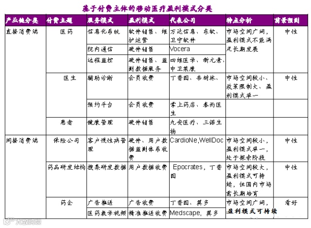 在移动医疗产业链中,核心业务参与方是资金流的主要关联对象,也就是产业链盈利的主要来源。产品/服务端通过为消费端提供设备、服务和数据,获得相应的资金收入,从而衍生出不同的盈利模式。我们认为,两大消费端可以衍生出六大盈利模式,对于直接消费端:分别面向医院、医生、患者收费;对于间接消费端:分别面向保险公司、药品研发机构、药企收费。