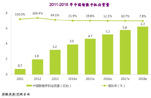 2014年中国智能手机出货量达到3.9亿台,同比增长21.9%,未来仍会保持平稳增长。中国智能手机出货量持续保持增长状态,有以下几点原因:一是第二波换机潮已经到来。经过几年的高速发展,最初由功能机升级为智能机的用户相继到了再次换机时间,市场需求旺盛;二是国内手机厂商竞争激烈,不断推出高配低价手机,以吸引消费者购买,释放潜在需求;三是4G网络的建设完善,使得原本使用2G、3G网络的用户,为享受更高速的数据服务,在运营商的引导推动下,纷纷选择升级手机。