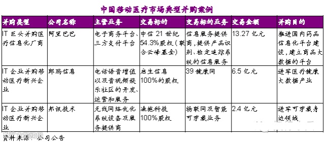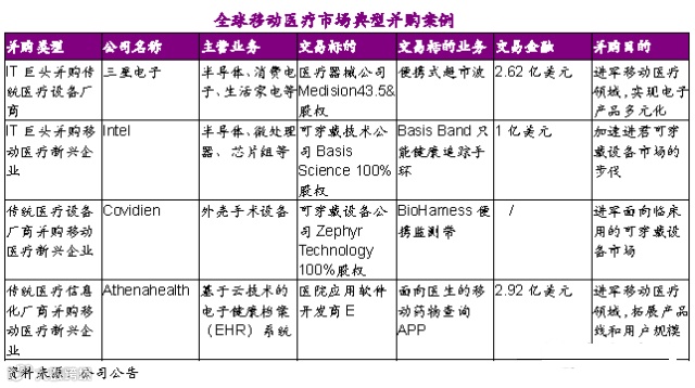 全球移动医疗市场已经进入高速发展期,盈利模式逐渐清晰和产品服务稳步成熟驱动市场规模迅速膨胀,三大阵营仅依靠自身优势无法跟上市场扩张的脚步,并购成为了企业快速切入市场的重要手段。通过遍历近三年的全球市场,我们发现:IT 巨头、传统医疗信息化和设备厂商是移动医疗市场并购主角,而选择的并购标的大都是移动医疗新兴企业,这或将成为未来移动医疗市场并购的主要特征。