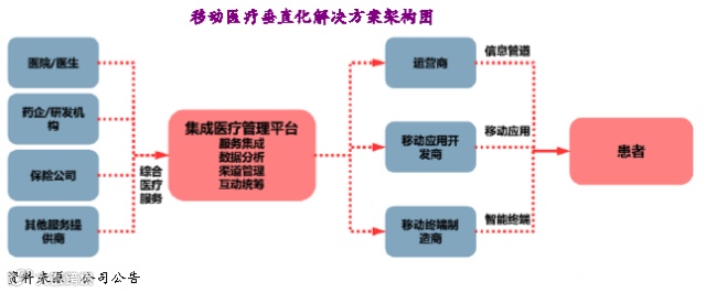 我们认为,垂直化解决方案不仅能提供端到端的综合化服务,包括病人教育、诊断服务、持续的疾病管理和治疗等,还能搭建完整商业闭环,形成成熟稳定的盈利模式,包括药企广告精准推送、保险公司精准化定价等。垂直化解决方案将具有两大鲜明特点:1.不再局限于功能单一的移动应用,而是形成以集成医疗管理平台为核心,包括智能终端、移动应用等软硬件在内的综合移动医疗体系;2.不再局限于少数参与方,而是联合医疗产业链中的大多数成员,打通医院、移动应用开发商、移动终端制造商、运营商、药企、研发机构、保险公司等各个利益相关方之间的合作通道。
