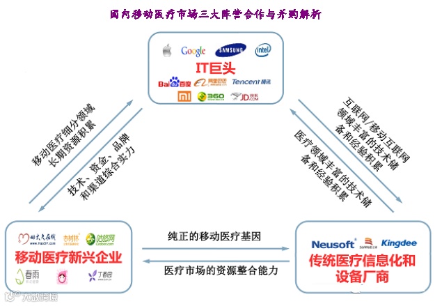 我们在前文已经提到,当前移动医疗是三大阵营相互博弈的市场,它们分别是:借移动医疗浪潮崛起的新兴企业,觊觎移动医疗巨大潜力而蠢蠢欲动的IT 巨头,面对移动医疗犹豫不定的传统医疗信息化和设备厂商。我们认为,三大阵营在市场中各具优势:新兴企业具备最纯正的移动医疗基因,对专注的细分领域有长期的资源积累,形成了一定的进入壁垒;IT 领域科技巨头具备强大的技术、资金、品牌和渠道综合实力,在市场中拥有无与伦比的号召力;传统医疗信息化和设备厂商拥有医疗领域最为丰富的技术储备和经验积累,特别是其在医疗市场的资源整合能力尤为关键。