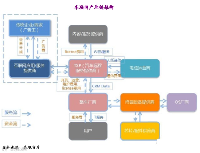 车联网产业链架构可以分为五大角色:CP(Content Provider,内容提供商)、NP(Network Provider,网络提供商)、TSP(Telematics Service Provider,车联网服务提供商)、EP(Equipment Provider,终端提供商)以及VM(Vehicle Manufacturer,汽车制造商)。