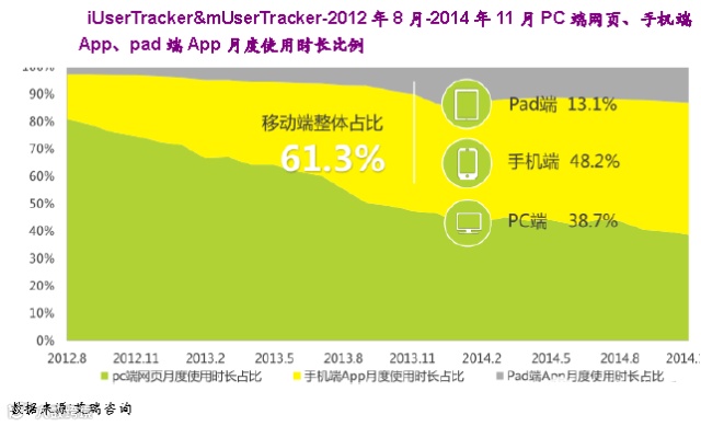 2012年8月,移动端月度使用时长比例仅为19.1%,到2014年11月已增长到61.3%,2年间增长了221%。移动端使用时长占比会继续扩大,一是因为智能终端的深入渗透,移动网民的稳定增长;二是传统互联网领域如电商、游戏等2C服务愈加成熟完善,创新细分领域如医疗、教育等愈发多元,吸引并引导更多网民向移动端倾斜。