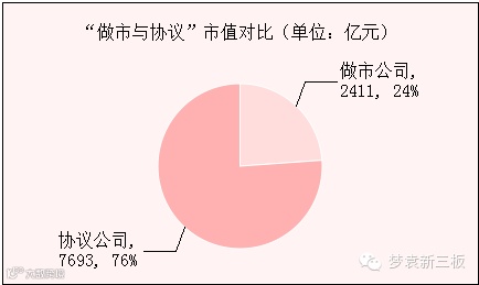 新三板挂牌公司的总市值达到10104亿元,其中做市公司总市值2411亿元,协议公司7693亿元。从平均市值来看,新三板总体、做市公司、协议公司的平均市值分别为4.67亿元、10.95亿元、3.96亿元。