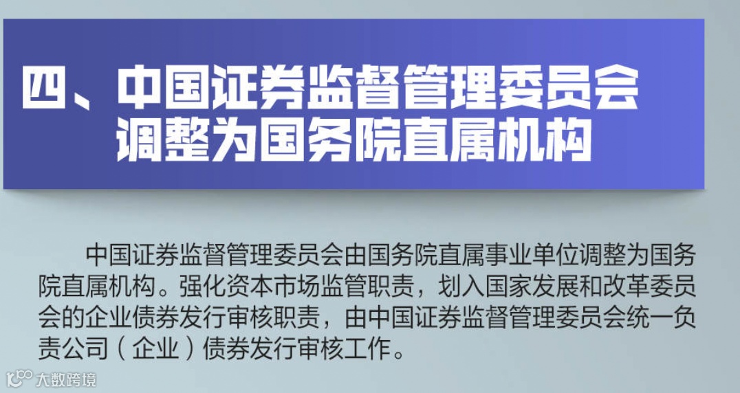 根据国务院关于提请审议国务院机构改革方案的议案,中国证券监督管理委员会调整为国务院直属机构。中国证券监督管理委员会由国务院直属事业单位调整为国务院直属机构。