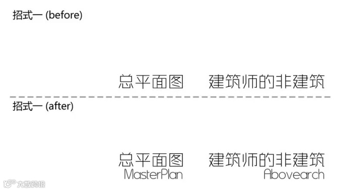 解读:很多童鞋觉得用英文排版好看,为什么呢?因为英文字母构成简单,灵活多变,总而言之具有图形感,所以第一招就是双语编排,尤其是标题和重要段落(比如文本扉页、文本/展板的固定格式部分,通常为项目名称)。