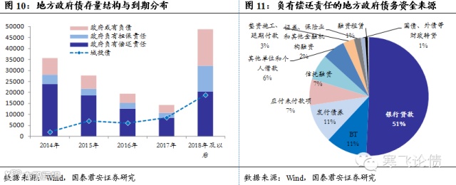 地方政府债务结构上,根据2013年6月发布的地方债务审计结果,在地方政府负有偿还责任的债务中,银行贷款占比约51%,总规模为5.52万亿;债券融资占比11%,规模为1.16万亿;BT融资占比11%,信托来源占比7%,证券、保险和其他金融机构融资占比1.8%、融资租赁占比0.7%。