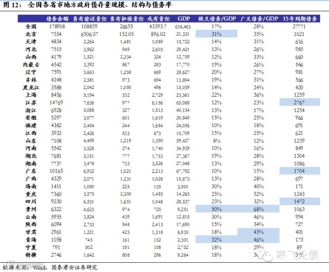 不同省市间地方负债率差异非常大,江苏、广东和四川2015年到期债务量最大。根据2013年6月公布的30省市地方债务余额,用狭义负债率(地方负有偿还责任债务/GDP)、广义负债率(地方总债务余额/GDP)衡量各个地方的债务水平,可以看出,不同省份之间负债率差异非常大,从最高的贵州68%到最低的山东12%,全国平均水平在60%左右,从债务绝对规模水平看,江苏、广东和四川的债务规模最大。