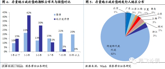 存量地方债的期限结构分布,1年以下占比15%,1-3年占比42%,3-5年占比30%,5-7年占比11%,7年以上占比3%,平均加权剩余久期为3年。