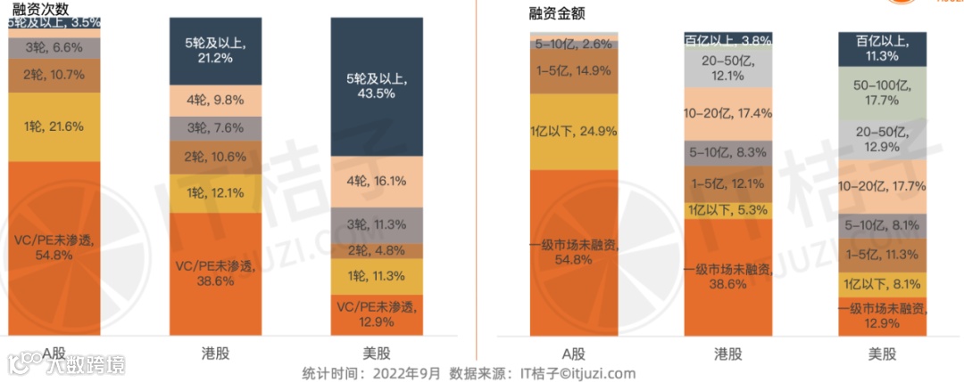 反观过去三年在美股上市的中概股,则是另一番景象。一方面我们观察到赴美上市的中概股,超过70%在上市前获得了3轮以上的投资,接近60%的中概股在上市前至少获得超过10亿人民币的融资。这说明在美股上市的中国企业,更加需要资本的驱动和助推,而且中国境内的美元基金相对更容易“抱团”,在一级市场更容易形成“融资接力”,美元的VC和PE在中国更容易形成一种上下游的“产业联盟”。