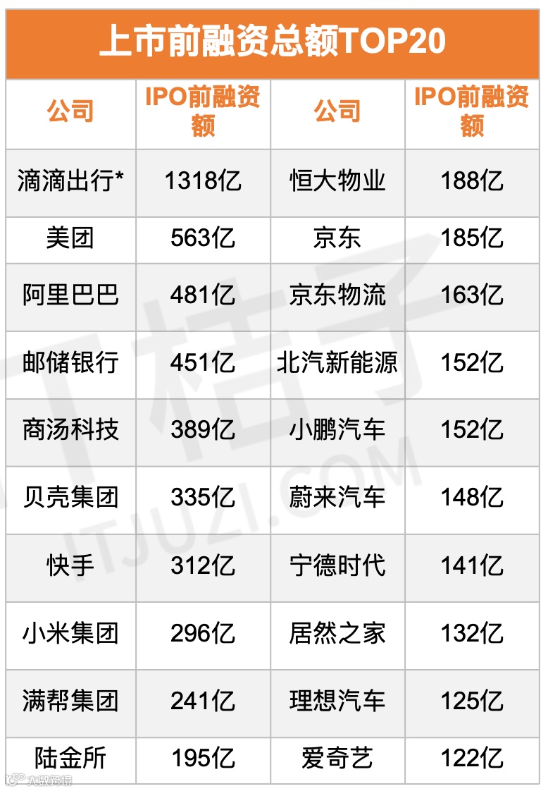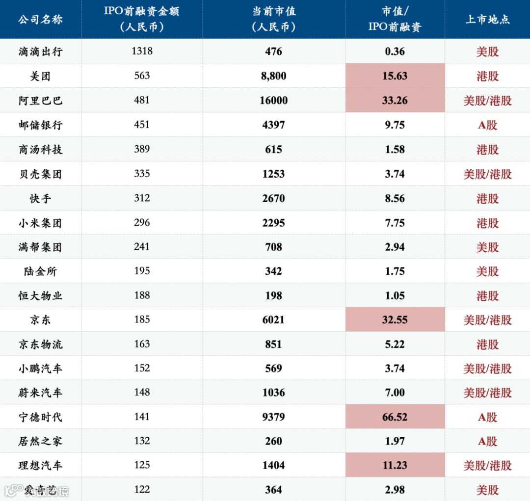上面这张图是IT桔子总结出的过去十年,中国企业上市前的融资总额排名TOP 20,数据未必一定准确,但还是具有比较强的代表性。进一步的,我把上述20家企业最终IPO后的市值拿出来做了一个统计,大家也可以看到一些有趣的现象。