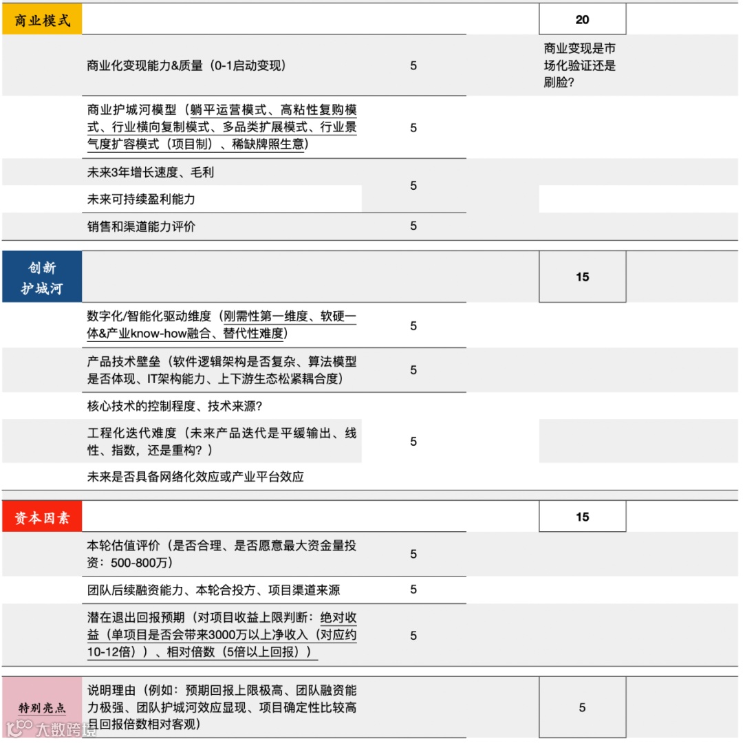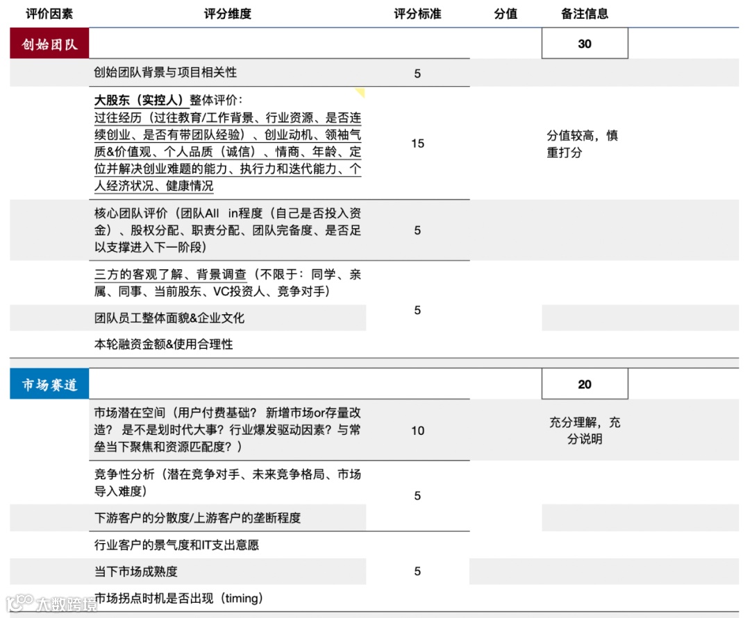 经历了上面的调研和分析,以及跟创始团队的几次接触,我们进入项目的打分流程。此时,7个人都要对项目进行公开的打分;这对立项人的要求还是很高的,因为每一位同事的打分,都会影响到项目是否会进入到下一个阶段。后来发现这个打分对于项目的复盘还是起到了重要的作用,同时也督促内部员工认真对待每一个项目。