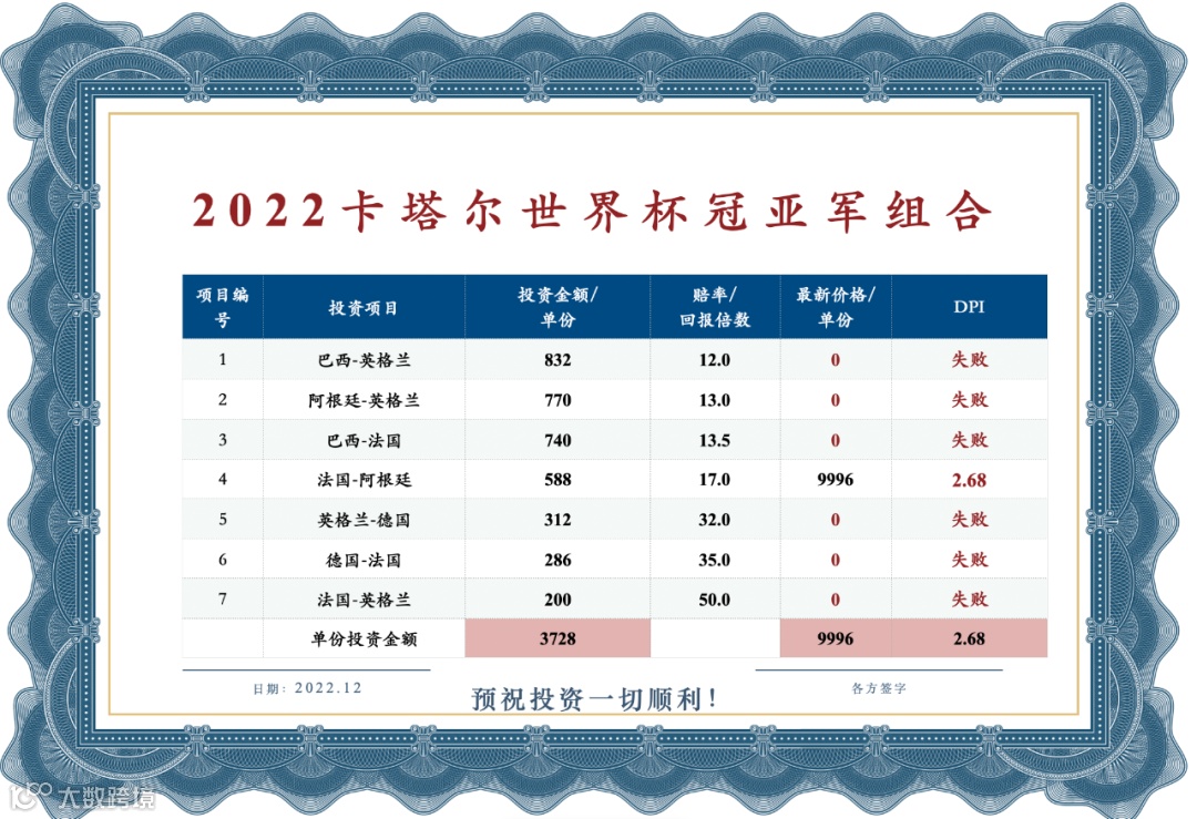 本届世界杯在开赛前,我们团队也买了彩票。这次买彩票延续了我们主基金盲池的投资策略(买了冠亚军的投资组合,而没有买单场比赛结果);四周时间,最终很幸运地收获了还不错的DPI,如果折合成税前,也有3倍的DPI了。
