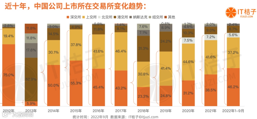 此后,受到中美外部关系的影响以及中国本土科创板和北交所的推出,境外上市比例逐年下降,直到A股重新成为中国企业IPO的绝对主战场。