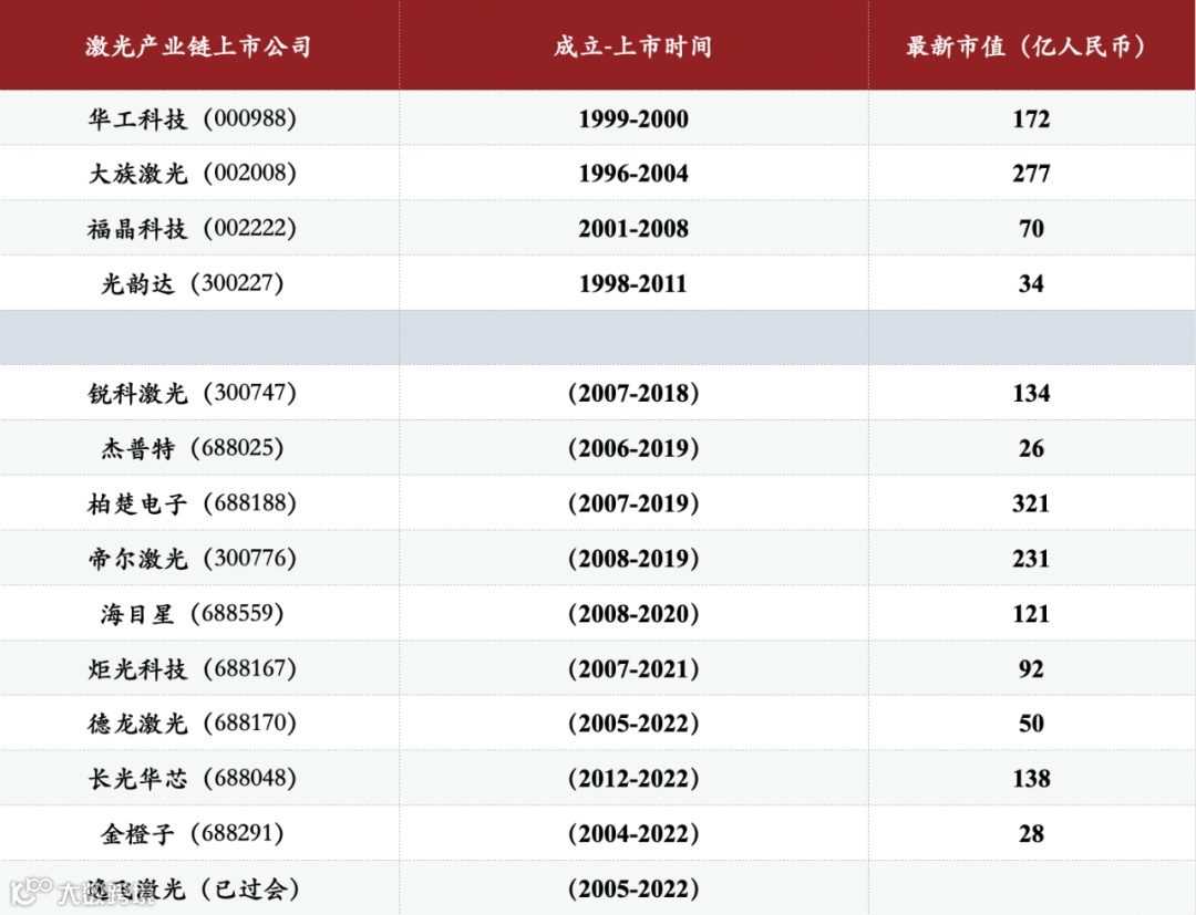 中国的激光产业出现了两次分水岭,第一批企业是在2000年左右成立,在2010年以前完成了IPO。第二批企业诞生于2006年前后,然后系统性的在2018-2022年迎来了IPO上市潮,而且上市后的市值表现都相对不错;说明激光产业链经历了两拨浪潮后,下游应用场景得到巨大释放。所以在工业场景领域,激光产业是过去几年难得的系统性投资机会。