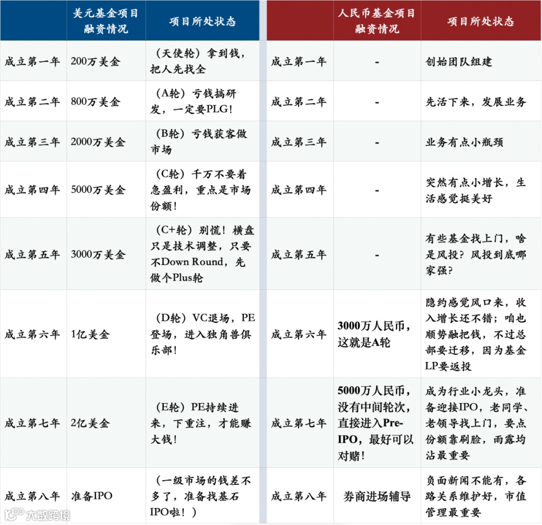 对比美元/人民币两种类型基金在一级市场投资项目的风格,我们列出了下面的表格。