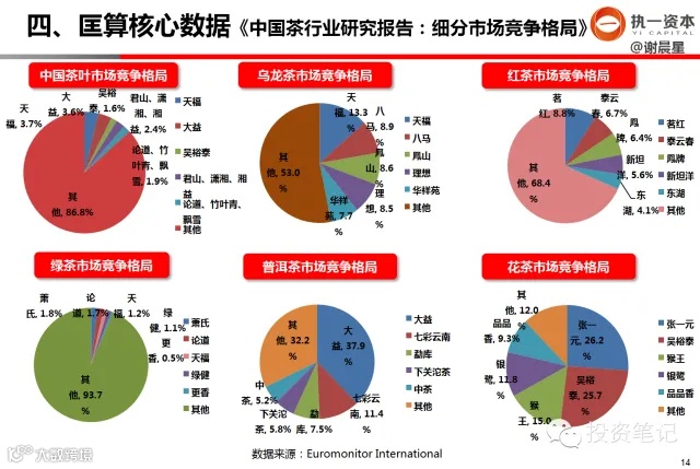 相较于互联网行业,传统的茶行业由于受地域分布广泛、品类众多、生产流通复杂、目标客户人群年龄偏大等因素所限,目前的市场集中度仍然非常低,CR5=13.2%,但是,一些新兴的面向年轻人的茶叶电商、互联网茶品牌正在崛起,有望成为中国的立顿。