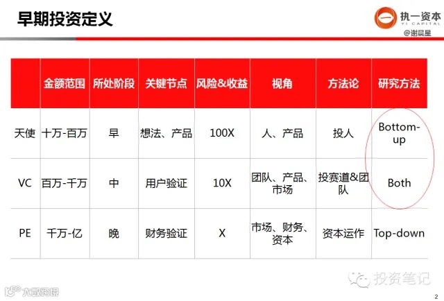 早期投资的视角主要在团队、产品上,而中后期投资的关注点主要在市场和财务上。但是,一个优秀的VC需要兼具这两种视角,既能和创业者交流技术架构、产品逻辑,又能分析行业大势、搞定资本运作,同样在做行业研究时也要兼顾把握微观与宏观视角。
