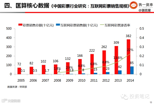 1、存量市场规模,大池子才能养大鱼,中国住宅商品房2013年销售额8.1万亿,小微型企业2012年贷款规模19.1万亿,汽车行业2014年销售额3.3万亿,彩票2014年销售额3820亿。只有正确的定位在一个巨大的市场中,才有机会成长为行业巨头。