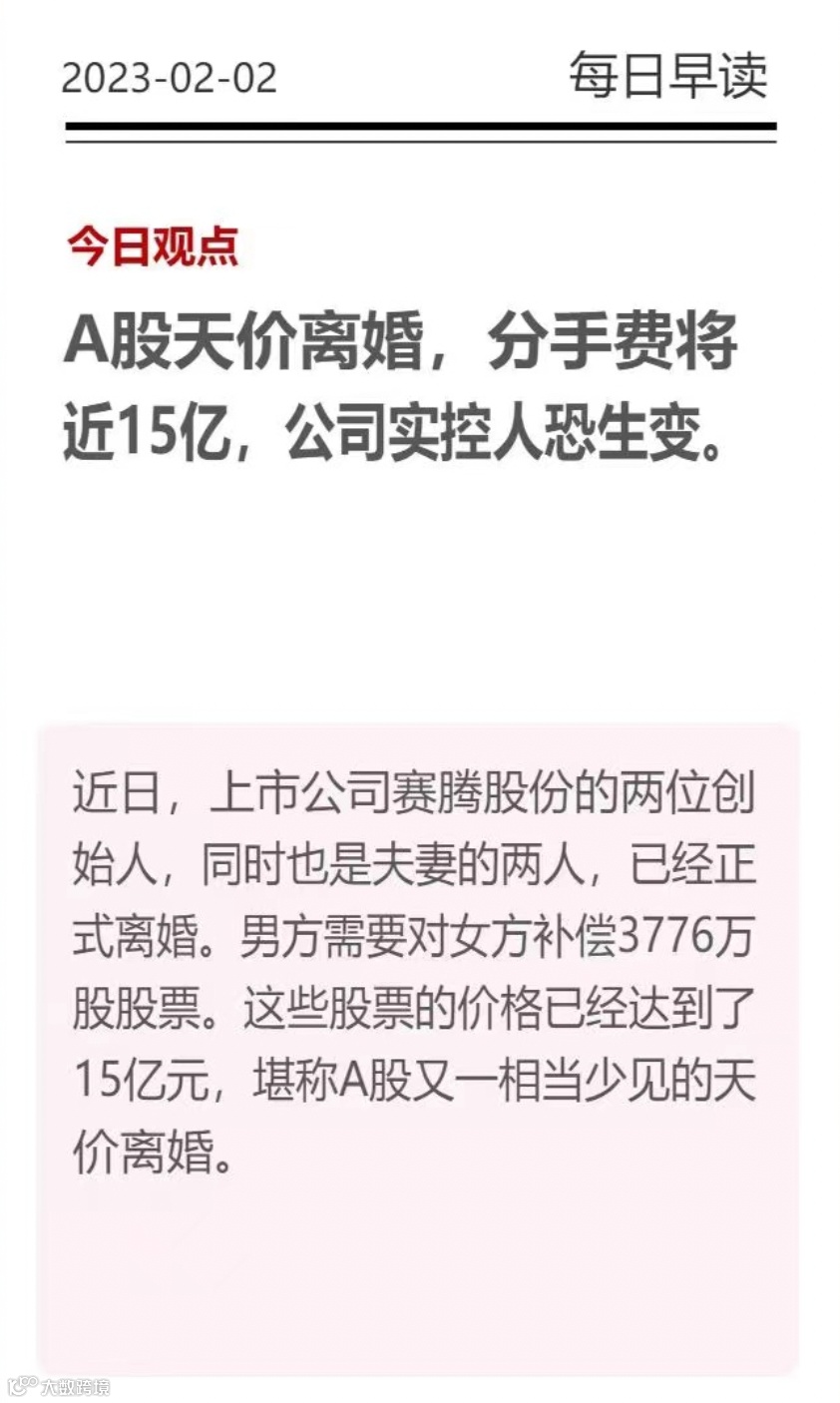 上市公司赛腾股份(603283.SH)创始人两口子正式离婚。