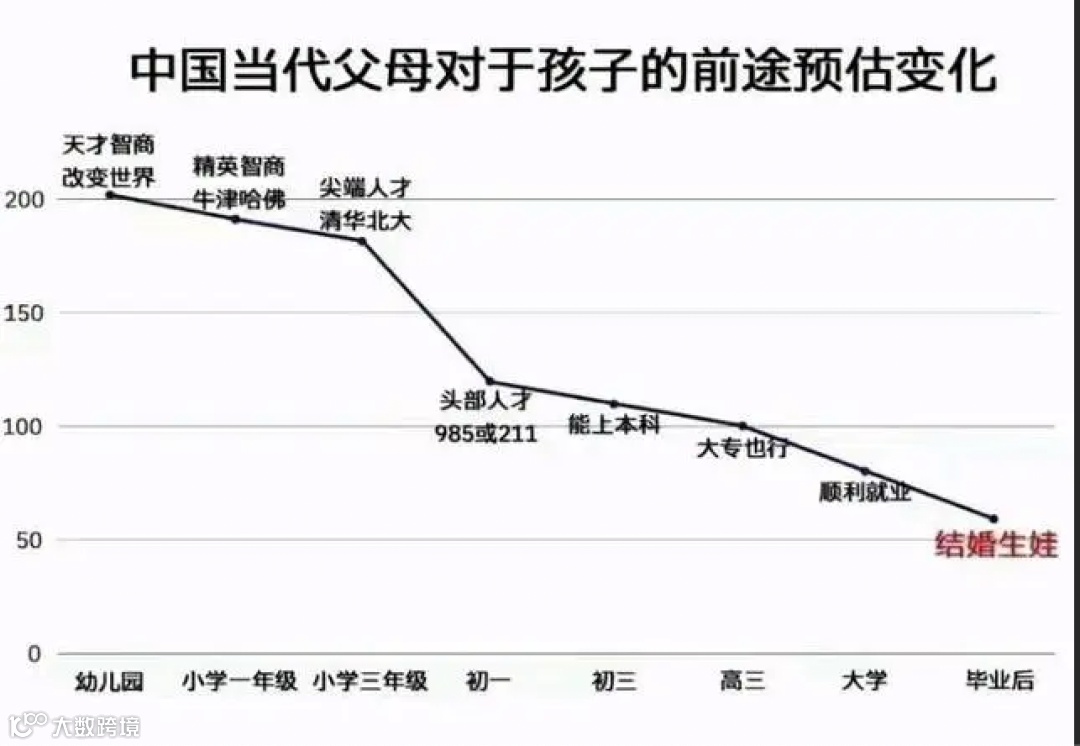 我在网上还看到过这样的一幅图,中国当代父母对孩子的前途预估变化,随着时间的推移,父母对孩子的期待呈明显的下降趋势。